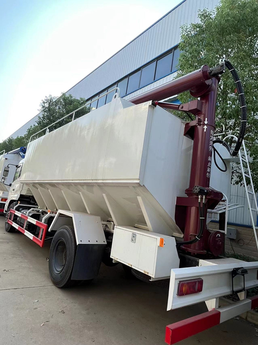散裝飼料運(yùn)輸車,散裝飼料車的飼料罐架設(shè)在卡車的底盤上,罐頂開有進(jìn)料口.頂部的一根螺旋輸送卸料管(俗稱卸料絞龍)則可自由回轉(zhuǎn)和抬升,抬升的仰角可達(dá)60度。運(yùn)輸時(shí),頂部的螺旋管平臥在罐頂;卸料時(shí)則抬起,使管端的出料口與畜禽飼養(yǎng)場(chǎng)貯料罐頂部的進(jìn)料門相接,駕駛室內(nèi)裝有操縱裝置(操縱裝置也可裝置在罐體尾部),卸料時(shí)通過(guò)車底的動(dòng)力輸出軸和減速器來(lái)驅(qū)動(dòng)螺旋,以完成卸料。
