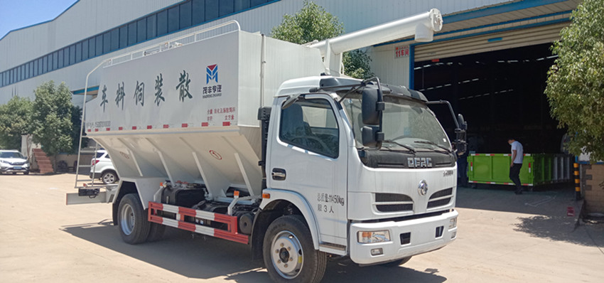 散裝飼料運(yùn)輸車,散裝飼料車的飼料罐架設(shè)在卡車的底盤上,罐頂開(kāi)有進(jìn)料口.頂部的一根螺旋輸送卸料管(俗稱卸料絞龍)則可自由回轉(zhuǎn)和抬升,抬升的仰角可達(dá)60度。運(yùn)輸時(shí),頂部的螺旋管平臥在罐頂;卸料時(shí)則抬起,使管端的出料口與畜禽飼養(yǎng)場(chǎng)貯料罐頂部的進(jìn)料門相接,駕駛室內(nèi)裝有操縱裝置(操縱裝置也可裝置在罐體尾部),卸料時(shí)通過(guò)車底的動(dòng)力輸出軸和減速器來(lái)驅(qū)動(dòng)螺旋,以完成卸料。