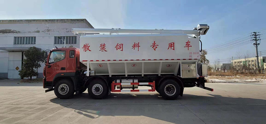 散裝飼料運(yùn)輸車,散裝飼料車的飼料罐架設(shè)在卡車的底盤上,罐頂開有進(jìn)料口.頂部的一根螺旋輸送卸料管(俗稱卸料絞龍)則可自由回轉(zhuǎn)和抬升,抬升的仰角可達(dá)60度。運(yùn)輸時(shí),頂部的螺旋管平臥在罐頂;卸料時(shí)則抬起,使管端的出料口與畜禽飼養(yǎng)場(chǎng)貯料罐頂部的進(jìn)料門相接,駕駛室內(nèi)裝有操縱裝置(操縱裝置也可裝置在罐體尾部),卸料時(shí)通過車底的動(dòng)力輸出軸和減速器來驅(qū)動(dòng)螺旋,以完成卸料。